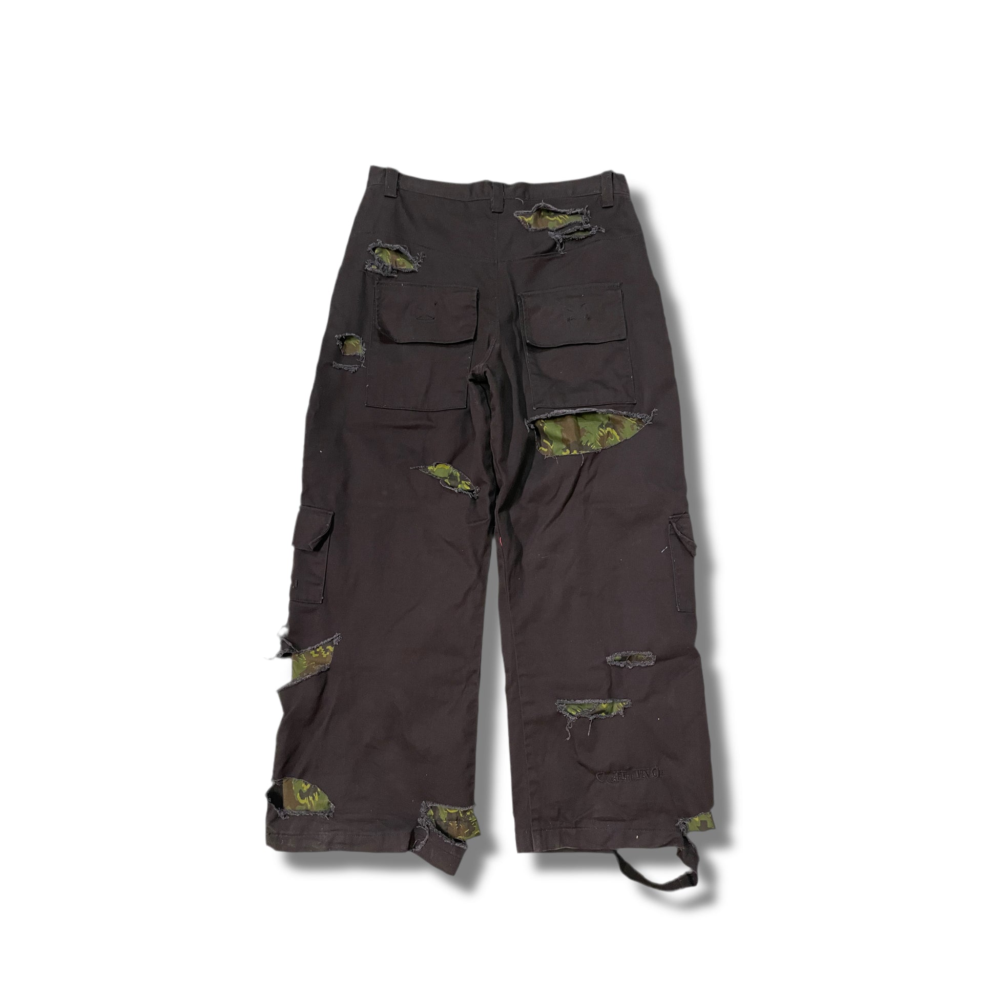 Black cargo pants featuring heavy distressed details with green camouflage fabric peeking through the ripped areas. Designed with multiple pockets and a loose fit.