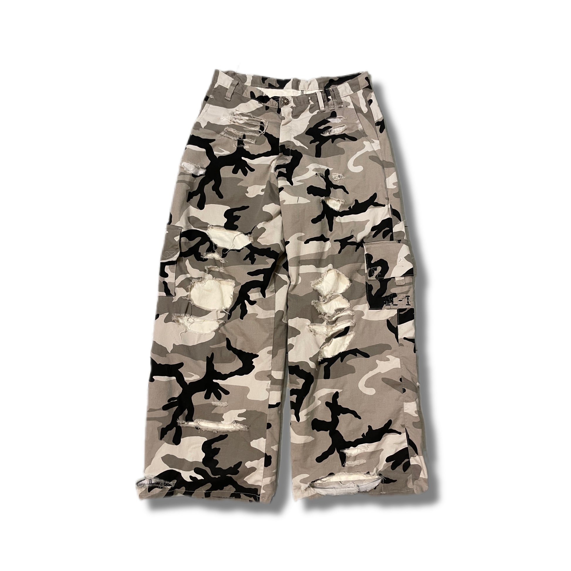 Distressed camo cargo pants