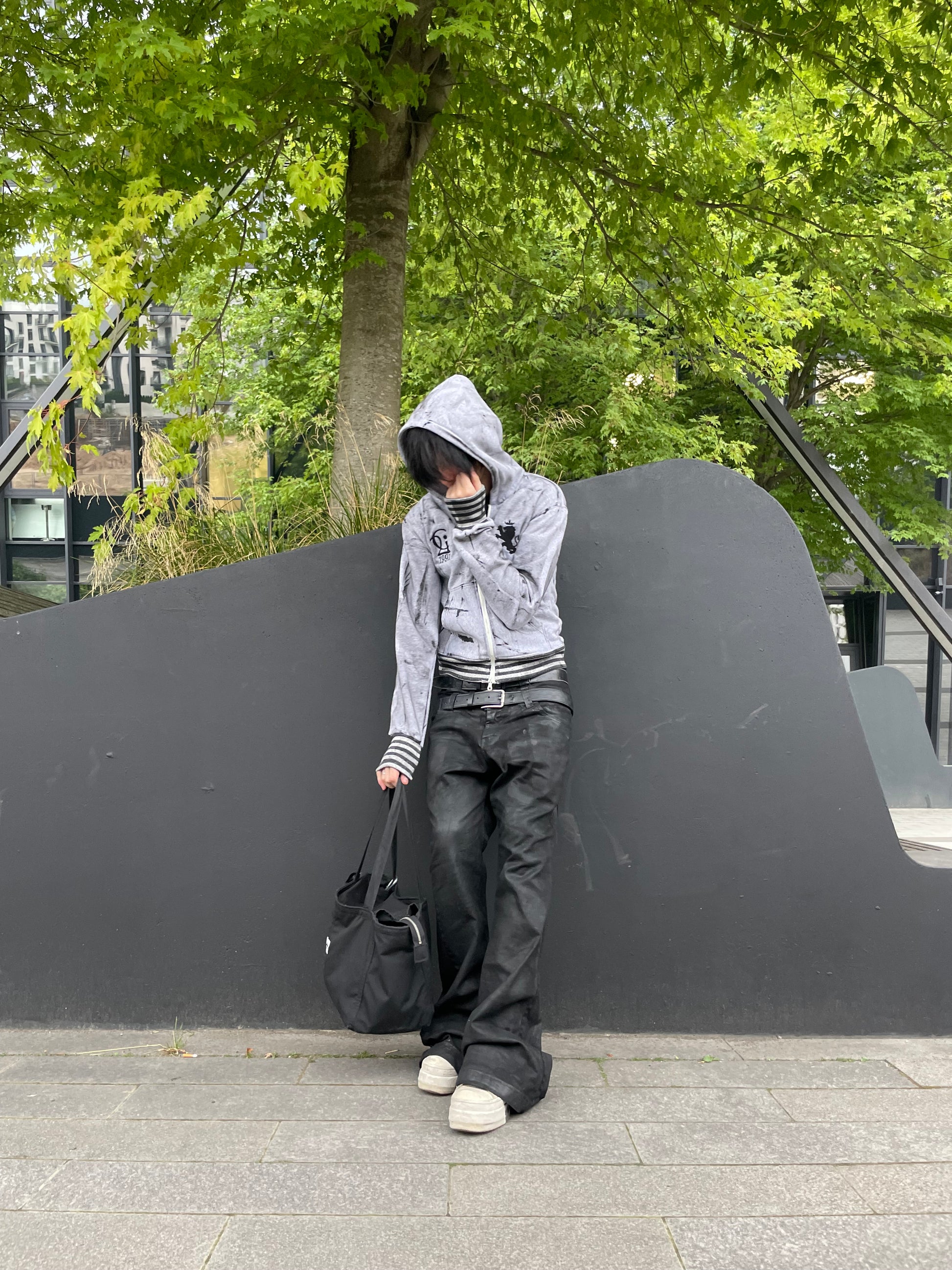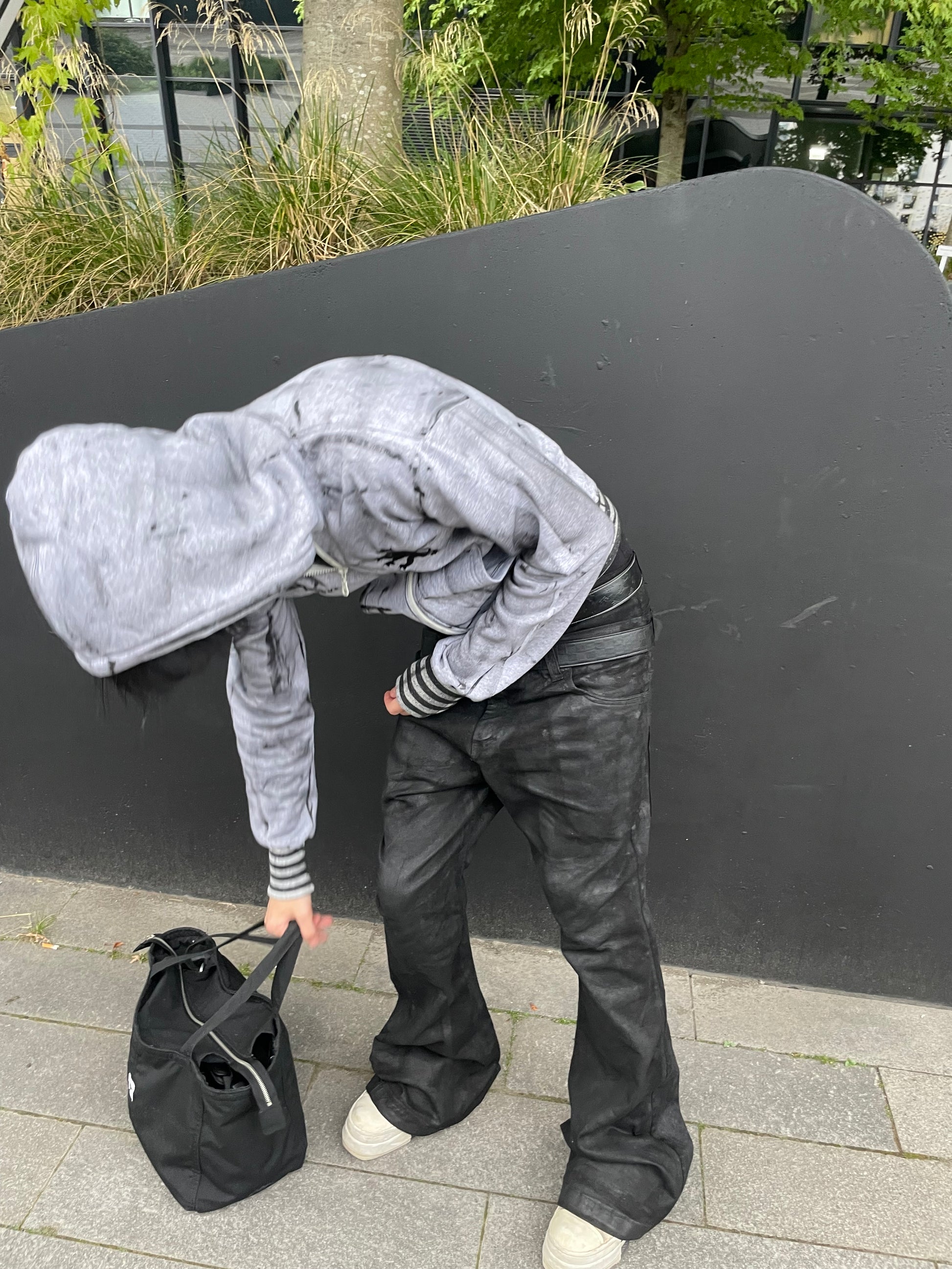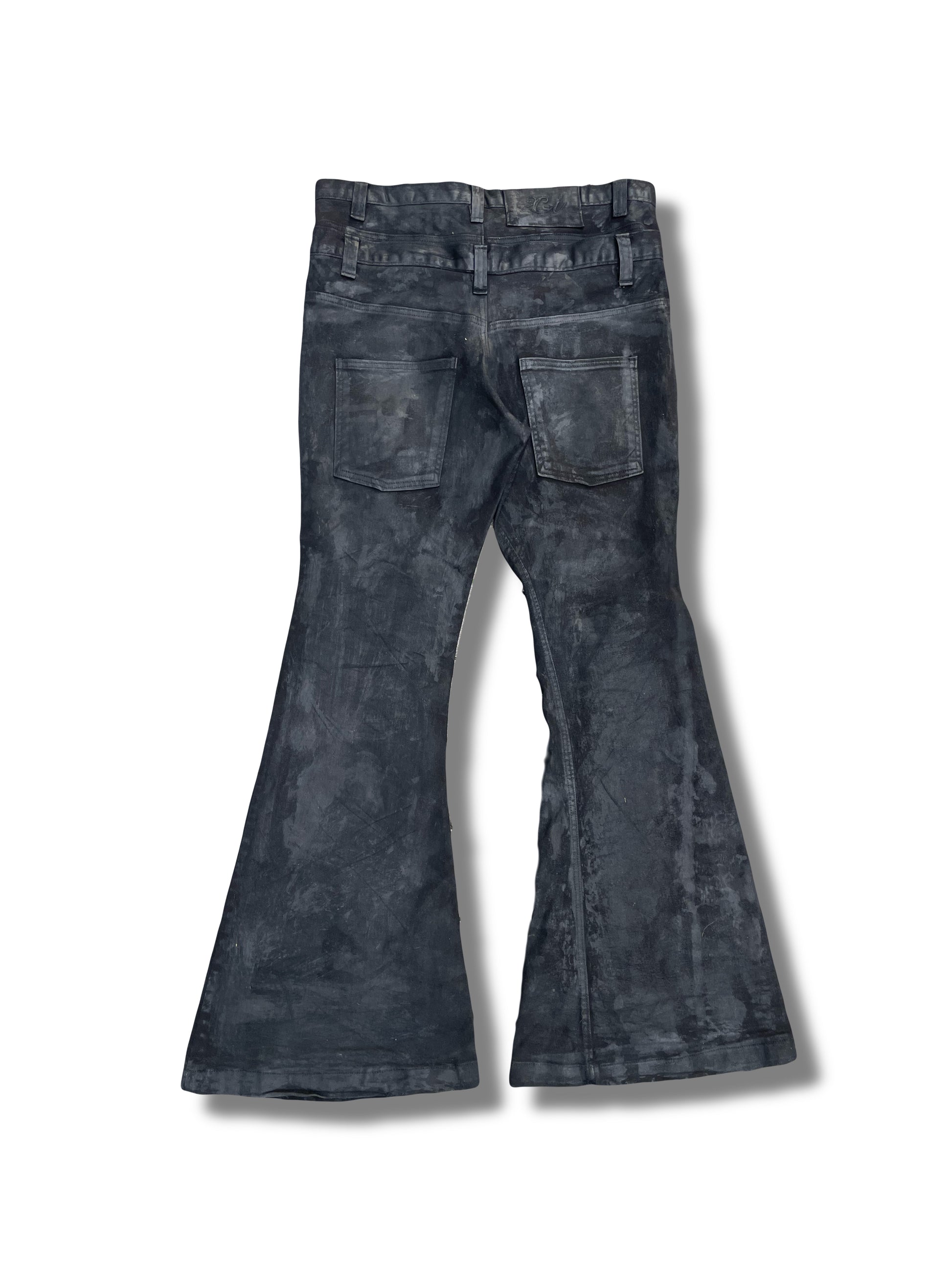 Our double-waist flared jeans have a coating that makes the fabric firmer and shinier.