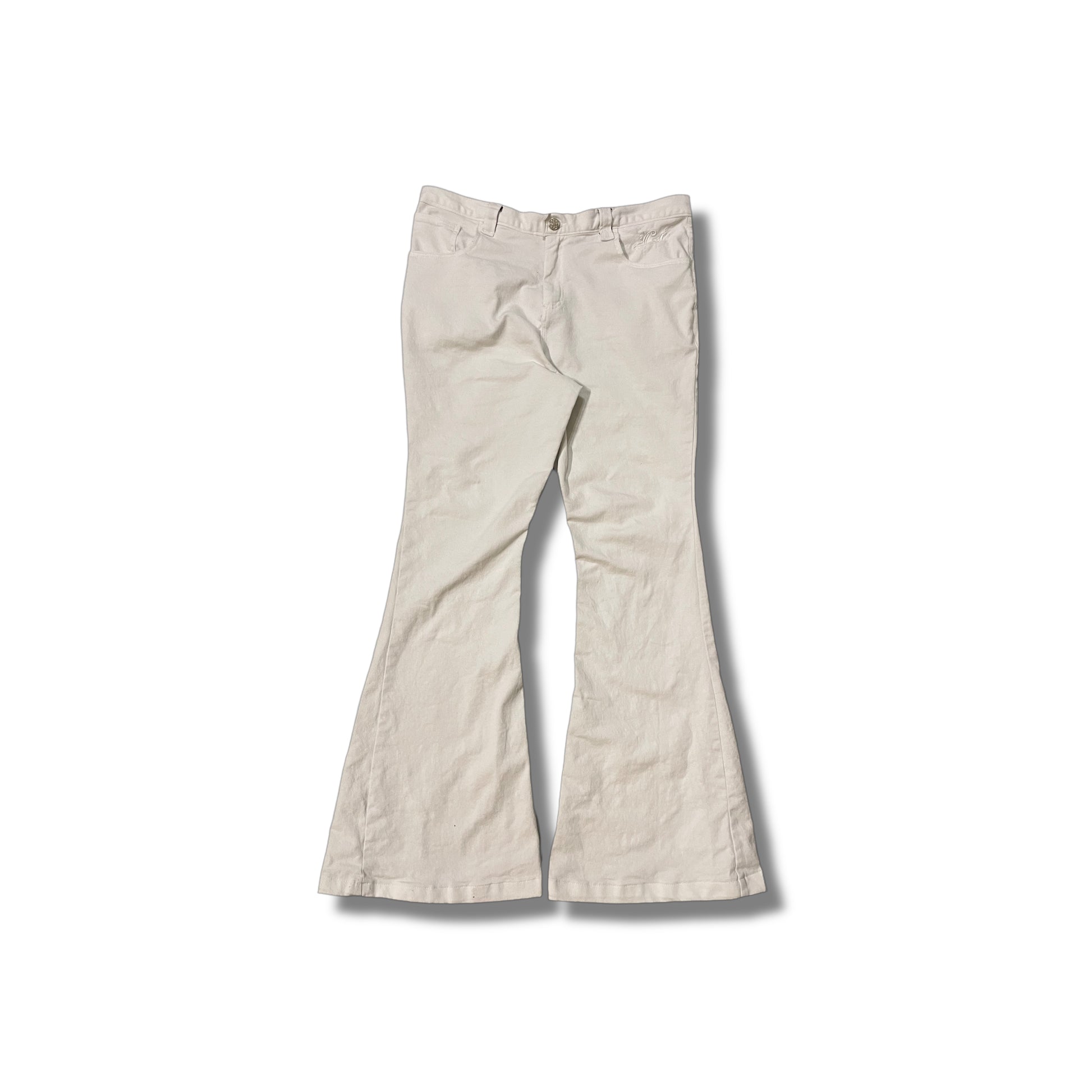 White flared jeans with embroidery on pocket