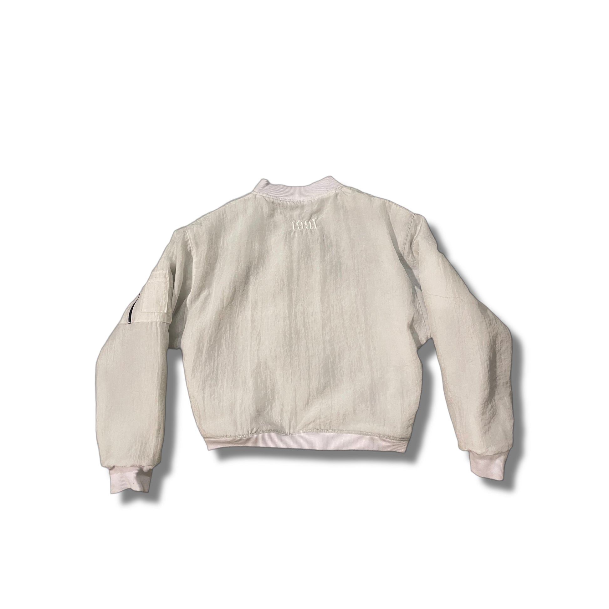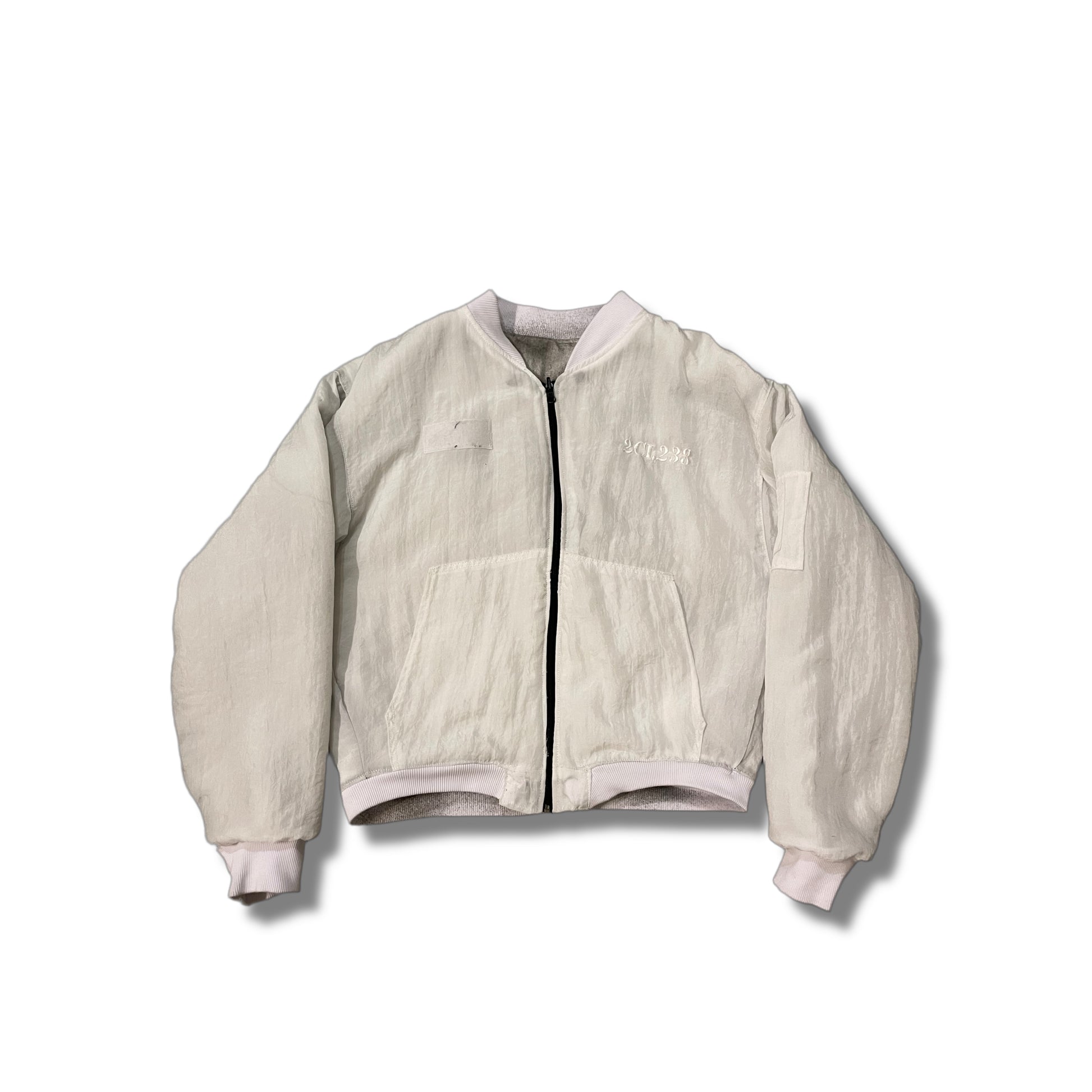 Double-sided bomber jacket, it can be worn both ways, one side is white, the other is dirtyThe bomber jacket has Velcro patches, and a embroidery's on both sides,winter stuffing,metal zipper